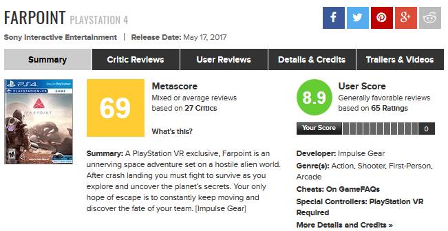 这次《Farpoint》在综合评分网站Metacritic获得了8.9分的用户评分,IGN也给予了7.5分的中肯评价(这个分数在PSVR游戏中已经不低了)。“光枪射击”能不能顺便借着VR的形式再火一把,我们拭目以待。