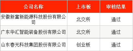 其中,拟在北交所IPO的安徽新富新能源科技股份有限公司(下称“新富科技”)、广东华汇智能装备股份有限公司(下称“华汇智能”),以及拟在创业板IPO的山东春光科技集团股份有限公司(下称“春光集团”)均成功过会。