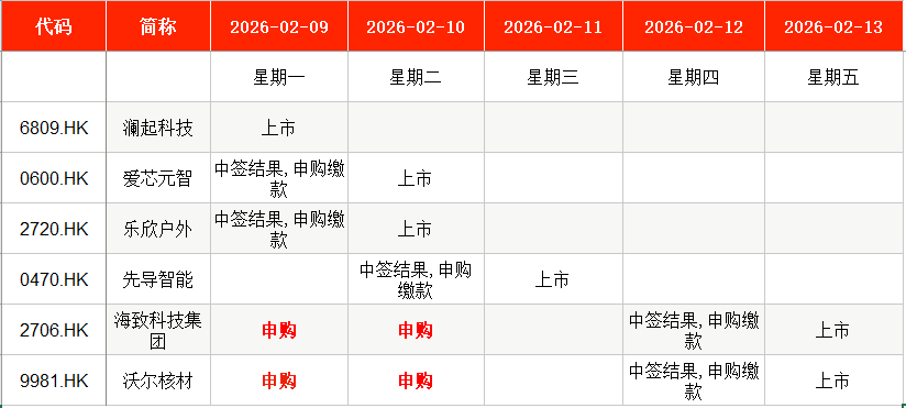 港股方面,Wind数据显示,本周(2月9日至2月13日),海致科技集团(、沃尔核材(09981.HK)等均将在本周一至本周二申购。