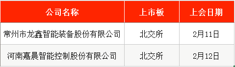 2月11日,北交所将审议常州市龙鑫智能装备股份有限公司(下称“龙鑫智能”)的首发事项。公司专注于超细粉体尤其是微纳米高端复合材料的制备装备及自动化生产线的研发、生产、销售和服务,逐步形成了研磨设备、干燥设备及物料自动化生产线日,北交所将审议河南嘉晨智能控制股份有限公司(下称“嘉晨智能”)的首发事项。公司主营业务为车辆智能驱动控制系统的研发、生产和销售,主要产品目前已广泛应用于工业车辆,并在高空作业平台、挖掘机等工程机械、工业机器人和场地车等领域实现应用。