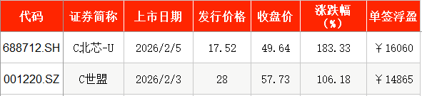 2月3日,世盟股份在深交所挂牌上市,发行价为28元/股,截至上市首日收盘,该股报57.73元/股,涨幅为106.18%。以收盘价计算,投资者中一签浮盈为1.49万元。